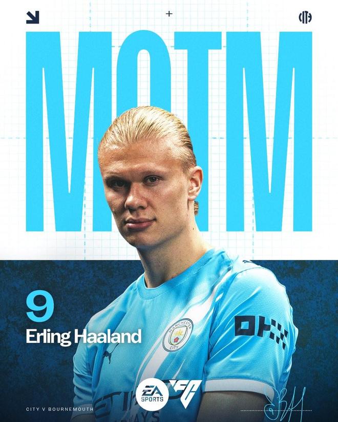 梅开二度,哈兰德当选曼城vs伯恩茅斯英超官方&队内全场最佳